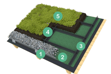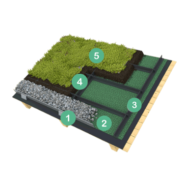 Ons groendaksysteem 10-30° is hier speciaal voor ontwikkeld en biedt een optimale balans tussen gewicht en begroeiing.